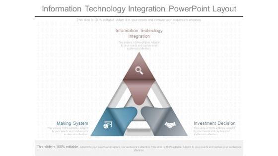 This is a information technology integration powerpoint layout. This is a three stage process. The stages in this process are information technology integration, making system, investment decision.