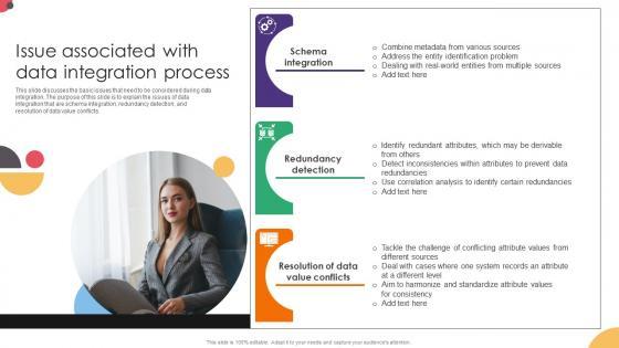 This slide discusses the basic issues that need to be considered during data integration. The purpose of this slide is to explain the issues of data integration that are schema integration, redundancy detection, and resolution of data value conflicts. Do you have to make sure that everyone on your team knows about any specific topic I yes, then you should give Issue Associated With Data Integration Process Data Integration Strategies For Business a try. Our experts have put a lot of knowledge and effort into creating this impeccable Issue Associated With Data Integration Process Data Integration Strategies For Business. You can use this template for your upcoming presentations, as the slides are perfect to represent even the tiniest detail. You can download these templates from the Slidegeeks website and these are easy to edit. So grab these today This slide discusses the basic issues that need to be considered during data integration. The purpose of this slide is to explain the issues of data integration that are schema integration, redundancy detection, and resolution of data value conflicts.