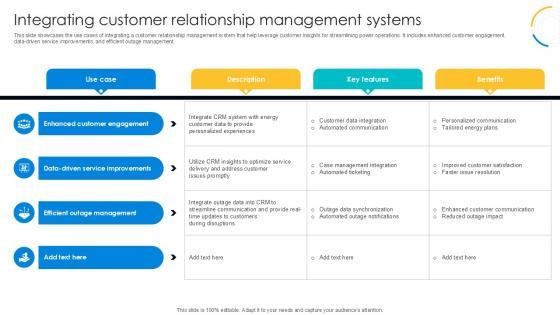 This slide showcases the use cases of integrating a customer relationship management system that help leverage customer insights for streamlining power operations. It includes enhanced customer engagement, data-driven service improvements, and efficient outage management. Presenting this PowerPoint presentation, titled Integrating Customer Relationship Digital Transformation Journey PPT Slide DT SS V, with topics curated by our researchers after extensive research. This editable presentation is available for immediate download and provides attractive features when used. Download now and captivate your audience. Presenting this Integrating Customer Relationship Digital Transformation Journey PPT Slide DT SS V. Our researchers have carefully researched and created these slides with all aspects taken into consideration. This is a completely customizable Integrating Customer Relationship Digital Transformation Journey PPT Slide DT SS V that is available for immediate downloading. Download now and make an impact on your audience. Highlight the attractive features available with our PPTs. This slide showcases the use cases of integrating a customer relationship management system that help leverage customer insights for streamlining power operations. It includes enhanced customer engagement, data-driven service improvements, and efficient outage management.