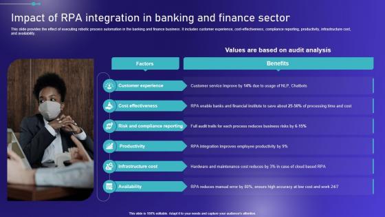 This slide provides the effect of executing robotic process automation in the banking and finance business. It includes customer experience, cost-effectiveness, compliance reporting, productivity, infrastructure cost, and availability. The best PPT templates are a great way to save time, energy, and resources. Slidegeeks have 100 percent editable powerpoint slides making them incredibly versatile. With these quality presentation templates, you can create a captivating and memorable presentation by combining visually appealing slides and effectively communicating your message. Download Impact Of RPA Integration In Banking And Finance Sector Template PDF from Slidegeeks and deliver a wonderful presentation.