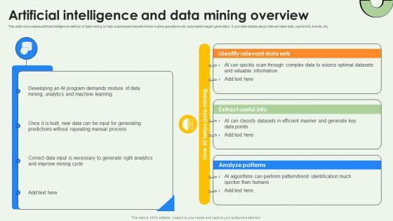 This slide showcases artificial intelligence method of data mining to help businesses transform their routine operations into automated insight generation. It provides details about relevant data sets, useful info, trends, etc. Explore a selection of the finest Data Warehousing And Artificial Intelligence And Data Mining Overview AI SS V here. With a plethora of professionally designed and pre-made slide templates, you can quickly and easily find the right one for your upcoming presentation. You can use our Data Warehousing And Artificial Intelligence And Data Mining Overview AI SS V to effectively convey your message to a wider audience. Slidegeeks has done a lot of research before preparing these presentation templates. The content can be personalized and the slides are highly editable. Grab templates today from Slidegeeks. This slide showcases artificial intelligence method of data mining to help businesses transform their routine operations into automated insight generation. It provides details about relevant data sets, useful info, trends, etc.