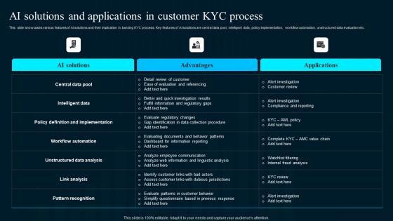 This slide showcases various features of AI solutions and their implication in banking KYC process. Key features of AI solutions are central data pool, intelligent data, policy implementation, workflow automation, unstructured data evaluation etc.Crafting an eye-catching presentation has never been more straightforward. Let your presentation shine with this tasteful yet straightforward Ai Solutions And Applications In Customer KYC Artificial Intelligence Applications Template Pdf template. It offers a minimalistic and classy look that is great for making a statement. The colors have been employed intelligently to add a bit of playfulness while still remaining professional. Construct the ideal Ai Solutions And Applications In Customer KYC Artificial Intelligence Applications Template Pdf that effortlessly grabs the attention of your audience. Begin now and be certain to wow your customers. This slide showcases various features of AI solutions and their implication in banking KYC process. Key features of AI solutions are central data pool, intelligent data, policy implementation, workflow automation, unstructured data evaluation etc.