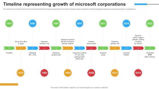 This slide shows a timeline which can be used to understand the progress and growth of microsoft. It includes various milestones related to geographic expansion, new product launches, acquisition etc. Find highly impressive Micosoft Intensive Growth Timeline Representing Growth Of Microsoft Corporations Strategy SS V on Slidegeeks to deliver a meaningful presentation. You can save an ample amount of time using these presentation templates. No need to worry to prepare everything from scratch because Slidegeeks experts have already done a huge research and work for you. You need to download Micosoft Intensive Growth Timeline Representing Growth Of Microsoft Corporations Strategy SS V for your upcoming presentation. All the presentation templates are 100 percent editable and you can change the color and personalize the content accordingly. Download now This slide shows a timeline which can be used to understand the progress and growth of microsoft. It includes various milestones related to geographic expansion, new product launches, acquisition etc.