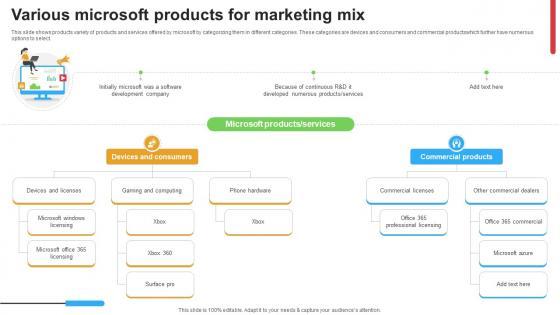 This slide shows products variety of products and services offered by microsoft by categorizing them in different categories. These categories are devices and consumers and commercial productswhich further have numerous options to select. If you are looking for a format to display your unique thoughts, then the professionally designed Micosoft Intensive Growth Various Microsoft Products For Marketing Mix Strategy SS V is the one for you. You can use it as a Google Slides template or a PowerPoint template. Incorporate impressive visuals, symbols, images, and other charts. Modify or reorganize the text boxes as you desire. Experiment with shade schemes and font pairings. Alter, share or cooperate with other people on your work. Download Micosoft Intensive Growth Various Microsoft Products For Marketing Mix Strategy SS V and find out how to give a successful presentation. Present a perfect display to your team and make your presentation unforgettable. This slide shows products variety of products and services offered by microsoft by categorizing them in different categories. These categories are devices and consumers and commercial productswhich further have numerous options to select.