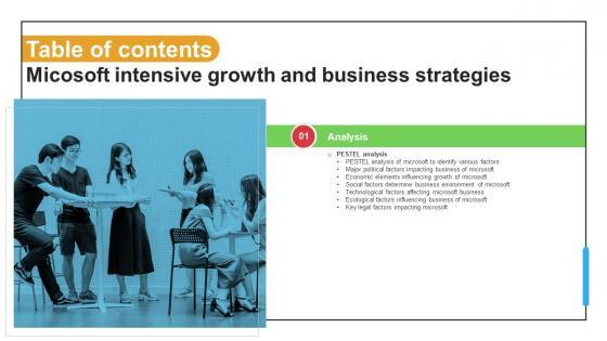 Are you in need of a template that can accommodate all of your creative concepts This one is crafted professionally and can be altered to fit any style. Use it with Google Slides or PowerPoint. Include striking photographs, symbols, depictions, and other visuals. Fill, move around, or remove text boxes as desired. Test out color palettes and font mixtures. Edit and save your work, or work with colleagues. Download Table Of Contents For Micosoft Intensive Growth And Business Strategies Strategy SS V and observe how to make your presentation outstanding. Give an impeccable presentation to your group and make your presentation unforgettable. Our Table Of Contents For Micosoft Intensive Growth And Business Strategies Strategy SS V are topically designed to provide an attractive backdrop to any subject. Use them to look like a presentation pro.