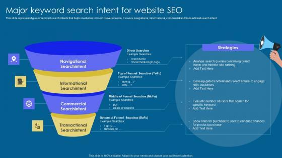 This slide represents types of keyword search intents that helps marketers to boost conversion rate. It covers navigational, informational, commercial and transactional search intent. Create an editable Deploying Online Marketing Major Keyword Search Intent For Website Seo Pictures PDF that communicates your idea and engages your audience. Whether youre presenting a business or an educational presentation, pre-designed presentation templates help save time. Deploying Online Marketing Major Keyword Search Intent For Website Seo Pictures PDF is highly customizable and very easy to edit, covering many different styles from creative to business presentations. Slidegeeks has creative team members who have crafted amazing templates. So, go and get them without any delay.