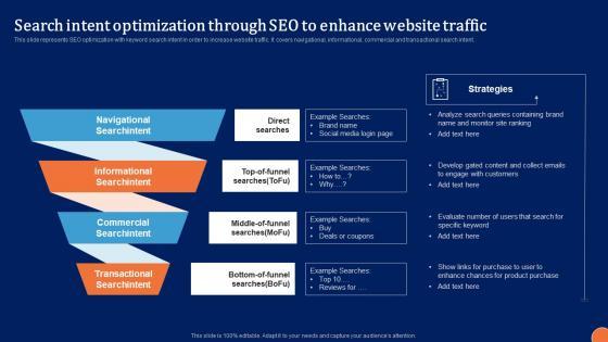 This slide represents SEO optimization with keyword search intent in order to increase website traffic. It covers navigational, informational, commercial and transactional search intent. Retrieve professionally designed Strategic Ecommerce Plan For B2B Enterprises Search Intent Optimization Through SEO To Enhance Website Traffic Information PDF to effectively convey your message and captivate your listeners. Save time by selecting pre-made slideshows that are appropriate for various topics, from business to educational purposes. These themes come in many different styles, from creative to corporate, and all of them are easily adjustable and can be edited quickly. Access them as PowerPoint templates or as Google Slides themes. You do not have to go on a hunt for the perfect presentation because Slidegeeks got you covered from everywhere.