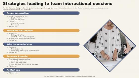 The slide showcases strategies that assist organisations in building trust among project teams and increasing customer retention. The elements are one-on-one meetings, appropriate body language, team member idea adoption, etc. Showcasing this set of slides titled Strategies Leading To Team Interactional Sessions Topics Pdf The topics addressed in these templates are Regular Open Meetings, Value Team, Member Ideas All the content presented in this PPT design is completely editable. Download it and make adjustments in color, background, font etc. as per your unique business setting. The slide showcases strategies that assist organisations in building trust among project teams and increasing customer retention. The elements are one-on-one meetings, appropriate body language, team member idea adoption, etc.