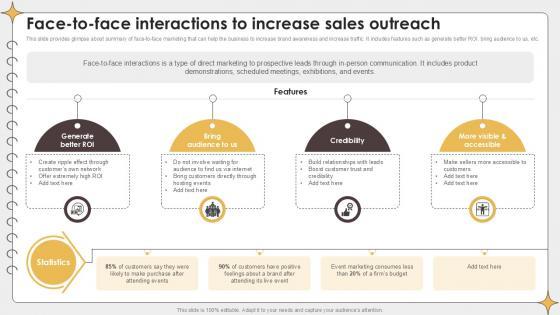 This slide provides glimpse about summary of face-to-face marketing that can help the business to increase brand awareness and increase traffic. It includes features such as generate better ROI, bring audience to us, etc. Coming up with a presentation necessitates that the majority of the effort goes into the content and the message you intend to convey. The visuals of a PowerPoint presentation can only be effective if it supplements and supports the story that is being told. Keeping this in mind our experts created Face To Face Interactions To Increase Planning Outreach Campaigns PPT Template to reduce the time that goes into designing the presentation. This way, you can concentrate on the message while our designers take care of providing you with the right template for the situation. This slide provides glimpse about summary of face-to-face marketing that can help the business to increase brand awareness and increase traffic. It includes features such as generate better ROI, bring audience to us, etc.