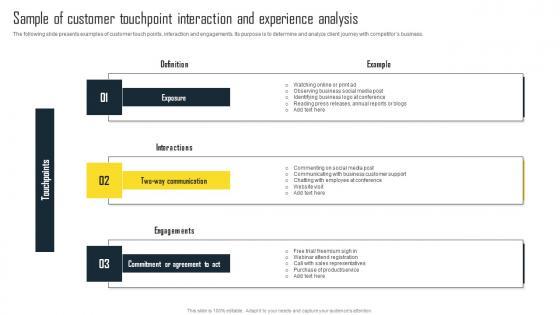 The following slide presents examples of customer touch points, interaction and engagements. Its purpose is to determine and analyze client journey with competitors business. If you are looking for a format to display your unique thoughts, then the professionally designed Sample Of Customer Touchpoint Interaction Efficient Plan For Conducting Competitor Microsoft Pdf is the one for you. You can use it as a Google Slides template or a PowerPoint template. Incorporate impressive visuals, symbols, images, and other charts. Modify or reorganize the text boxes as you desire. Experiment with shade schemes and font pairings. Alter, share or cooperate with other people on your work. Download Sample Of Customer Touchpoint Interaction Efficient Plan For Conducting Competitor Microsoft Pdf and find out how to give a successful presentation. Present a perfect display to your team and make your presentation unforgettable. The following slide presents examples of customer touch points, interaction and engagements. Its purpose is to determine and analyze client journey with competitors business.