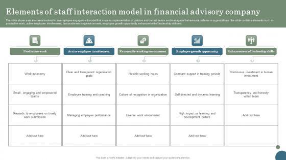 The slide showcases elements involved in an employee engagement model that assures implementation of policies and correct senior and managerial behavioural patterns in organizations. the slide contains elements such as productive work, active employee involvement, favourable working environment, employee growth opportunity, enhancement of leadership skills etc. Pitch your topic with ease and precision using this Elements Of Staff Interaction Model In Financial Advisory Company Infographics Pdf This layout presents information on Active Employee Involvement, Favourable Working Environment It is also available for immediate download and adjustment. So, changes can be made in the color, design, graphics or any other component to create a unique layout. The slide showcases elements involved in an employee engagement model that assures implementation of policies and correct senior and managerial behavioural patterns in organizations. the slide contains elements such as productive work, active employee involvement, favourable working environment, employee growth opportunity, enhancement of leadership skills etc.