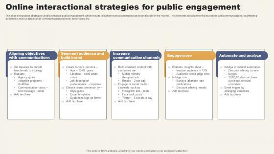 The slide showcases strategies used to enhance public engagement, which results in higher revenue generation and brand loyalty in the market. The elements are alignment of objectives with communications, segmenting audiences and building brands, communication channels, automating, etc. Showcasing this set of slides titled Online Interactional Strategies For Public Engagement Elements Pdf The topics addressed in these templates are Aligning Objectives, Communications, Build Brand All the content presented in this PPT design is completely editable. Download it and make adjustments in color, background, font etc. as per your unique business setting. The slide showcases strategies used to enhance public engagement, which results in higher revenue generation and brand loyalty in the market. The elements are alignment of objectives with communications, segmenting audiences and building brands, communication channels, automating, etc.