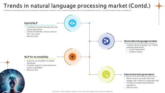 This slide showcases major trends in natural language processing market referable for users, investors and business owners. It provides details about conversational, emotional, multilingual, explainable, etc. The Trends In Natural Language Processing Market Crafting Interactions A Guide AI SS V is a compilation of the most recent design trends as a series of slides. It is suitable for any subject or industry presentation, containing attractive visuals and photo spots for businesses to clearly express their messages. This template contains a variety of slides for the user to input data, such as structures to contrast two elements, bullet points, and slides for written information. Slidegeeks is prepared to create an impression. This slide showcases major trends in natural language processing market referable for users, investors and business owners. It provides details about conversational, emotional, multilingual, explainable, etc.