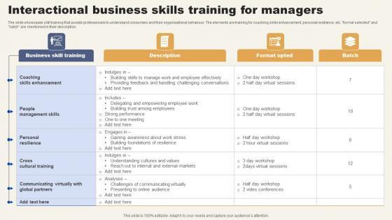 The slide showcases skill training that assists professionals to understand consumers and their organisational behaviour. The elements are training for coaching skills enhancement, personal resilience, etc. format selected and batch are mentioned in their description. Pitch your topic with ease and precision using this Interactional Business Skills Training For Managers Guidelines Pdf This layout presents information on Coaching Skills Enhancement, People Management Skills It is also available for immediate download and adjustment. So, changes can be made in the color, design, graphics or any other component to create a unique layout. The slide showcases skill training that assists professionals to understand consumers and their organisational behaviour. The elements are training for coaching skills enhancement, personal resilience, etc. format selected and batch are mentioned in their description.