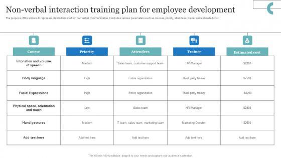 The purpose of this slide is to represent plan to train staff for non verbal communication. It includes various parameters such as courses, priority, attendees, trainer and estimated cost. Pitch your topic with ease and precision using this Non Verbal Interaction Training Plan For Employee Development Icons Pdf. This layout presents information on Non Verbal Interaction, Training Plan, Employee Development. It is also available for immediate download and adjustment. So, changes can be made in the color, design, graphics or any other component to create a unique layout. The purpose of this slide is to represent plan to train staff for non verbal communication. It includes various parameters such as courses, priority, attendees, trainer and estimated cost.