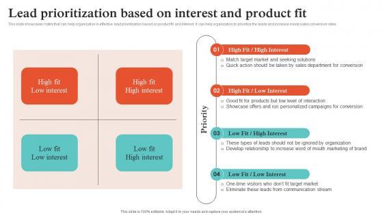 This slide showcases matrix that can help organization in effective lead prioritization based on product fit and interest. It can help organization to prioritize the leads and increase inside sales conversion rates. Take your projects to the next level with our ultimate collection of Virtual Sales Strategies Lead Prioritization Based On Interest Strategy SS V. Slidegeeks has designed a range of layouts that are perfect for representing task or activity duration, keeping track of all your deadlines at a glance. Tailor these designs to your exact needs and give them a truly corporate look with your own brand colors they will make your projects stand out from the rest This slide showcases matrix that can help organization in effective lead prioritization based on product fit and interest. It can help organization to prioritize the leads and increase inside sales conversion rates.