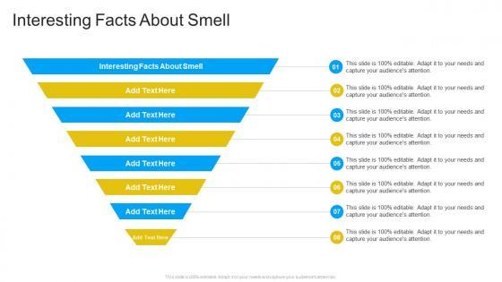 Introducing our well designed Interesting Facts About Smell In Powerpoint And Google Slides Cpb. This PowerPoint design presents information on topics like Interesting Facts About Smell. As it is predesigned it helps boost your confidence level. It also makes you a better presenter because of its high quality content and graphics. This PPT layout can be downloaded and used in different formats like PDF, PNG, and JPG. Not only this, it is available in both Standard Screen and Widescreen aspect ratios for your convenience. Therefore, click on the download button now to persuade and impress your audience. Our Interesting Facts About Smell In Powerpoint And Google Slides Cpb are topically designed to provide an attractive backdrop to any subject. Use them to look like a presentation pro.