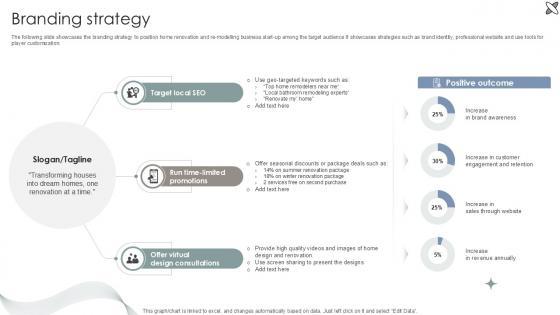 The following slide showcases the branding strategy to position home renovation and re-modelling business start-up among the target audience It showcases strategies such as brand identity, professional website and use tools for player customization. Boost your pitch with our creative Branding Strategy Interior Design Company Market Entry Plan PPT Sample GTM SS V. Deliver an awe-inspiring pitch that will mesmerize everyone. Using these presentation templates you will surely catch everyones attention. You can browse the ppts collection on our website. We have researchers who are experts at creating the right content for the templates. So you do not have to invest time in any additional work. Just grab the template now and use them. The following slide showcases the branding strategy to position home renovation and re-modelling business start-up among the target audience It showcases strategies such as brand identity, professional website and use tools for player customization.