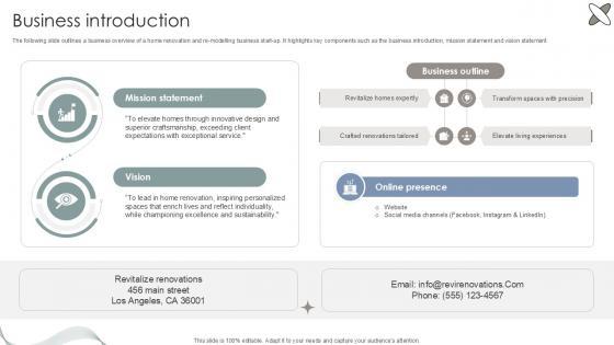 The following slide outlines a business overview of a home renovation and re-modelling business start-up. It highlights key components such as the business introduction, mission statement and vision statement. Create an editable Business Introduction Interior Design Company Market Entry Plan PPT Sample GTM SS V that communicates your idea and engages your audience. Whether you are presenting a business or an educational presentation, pre-designed presentation templates help save time. Business Introduction Interior Design Company Market Entry Plan PPT Sample GTM SS V is highly customizable and very easy to edit, covering many different styles from creative to business presentations. Slidegeeks has creative team members who have crafted amazing templates. So, go and get them without any delay. The following slide outlines a business overview of a home renovation and re-modelling business start-up. It highlights key components such as the business introduction, mission statement and vision statement.
