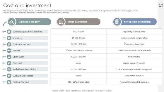 This slide presents financial analysis showing investment requirements to build and set up home renovation and re-modelling business start-up. It segments investment areas such as registration and licensing, marketing and advertising, office space, vehicles, office spaces and materials and supplies. There are so many reasons you need a Cost And Investment Interior Design Company Market Entry Plan PPT Example GTM SS V. The first reason is you can not spend time making everything from scratch, Thus, Slidegeeks has made presentation templates for you too. You can easily download these templates from our website easily. This slide presents financial analysis showing investment requirements to build and set up home renovation and re-modelling business start-up. It segments investment areas such as registration and licensing, marketing and advertising, office space, vehicles, office spaces and materials and supplies.