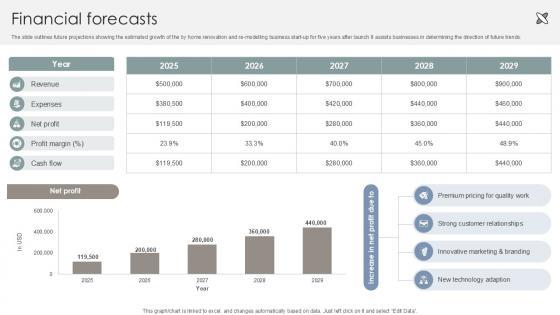 The slide outlines future projections showing the estimated growth of the by home renovation and re-modelling business start-up for five years after launch It assists businesses in determining the direction of future trends. Slidegeeks is here to make your presentations a breeze with Financial Forecasts Interior Design Company Market Entry Plan PPT Example GTM SS V With our easy-to-use and customizable templates, you can focus on delivering your ideas rather than worrying about formatting. With a variety of designs to choose from, you are sure to find one that suits your needs. And with animations and unique photos, illustrations, and fonts, you can make your presentation pop. So whether you are giving a sales pitch or presenting to the board, make sure to check out Slidegeeks first The slide outlines future projections showing the estimated growth of the by home renovation and re-modelling business start-up for five years after launch It assists businesses in determining the direction of future trends.