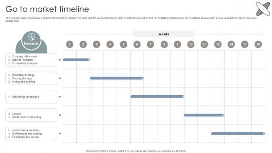 The following slide showcases a timeline showing time required for each task for successful market entry of a home renovation and re-modelling business start-up. It outlines phases such as pre-launch time, launch time and growth time. Do you have an important presentation coming up Are you looking for something that will make your presentation stand out from the rest Look no further than Go To Market Timeline Interior Design Company Market Entry Plan PPT Template GTM SS V. With our professional designs, you can trust that your presentation will pop and make delivering it a smooth process. And with Slidegeeks, you can trust that your presentation will be unique and memorable. So why wait Grab Go To Market Timeline Interior Design Company Market Entry Plan PPT Template GTM SS V today and make your presentation stand out from the rest The following slide showcases a timeline showing time required for each task for successful market entry of a home renovation and re-modelling business start-up. It outlines phases such as pre-launch time, launch time and growth time.