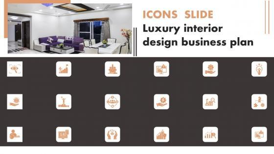 Introducing our well designed Icons Slide Luxury Interior Design Business Plan Designs Pdf set of slides. The slide displays editable icons to enhance your visual presentation. The icons can be edited easily. So customize according to your business to achieve a creative edge. Download and share it with your audience. Our Icons Slide Luxury Interior Design Business Plan Designs Pdf are topically designed to provide an attractive backdrop to any subject. Use them to look like a presentation pro.