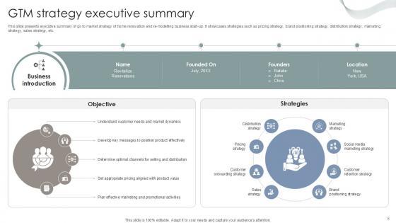 This slide presents executive summary of go to market strategy of home renovation and re-modelling business start-up. It showcases strategies such as pricing strategy, brand positioning strategy, distribution strategy, marketing strategy, sales strategy, etc. Whether you have daily or monthly meetings, a brilliant presentation is necessary. GTM Strategy Executive Interior Design Company Market Entry Plan PPT Example GTM SS V can be your best option for delivering a presentation. Represent everything in detail using GTM Strategy Executive Interior Design Company Market Entry Plan PPT Example GTM SS V and make yourself stand out in meetings. The template is versatile and follows a structure that will cater to your requirements. All the templates prepared by Slidegeeks are easy to download and edit. Our research experts have taken care of the corporate themes as well. So, give it a try and see the results. This slide presents executive summary of go to market strategy of home renovation and re-modelling business start-up. It showcases strategies such as pricing strategy, brand positioning strategy, distribution strategy, marketing strategy, sales strategy, etc.