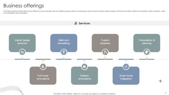 This slide presents products and services offered by home renovation and re-modelling business start-up. It showcases services such as interior design solutions, full home renovation, bathroom remodeling, custom carpentry, smart home integration and consultation. Slidegeeks is one of the best resources for PowerPoint templates. You can download easily and regulate Business Offerings Interior Design Company Market Entry Plan PPT Slide GTM SS V for your personal presentations from our wonderful collection. A few clicks is all it takes to discover and get the most relevant and appropriate templates. Use our Templates to add a unique zing and appeal to your presentation and meetings. All the slides are easy to edit and you can use them even for advertisement purposes. This slide presents products and services offered by home renovation and re-modelling business start-up. It showcases services such as interior design solutions, full home renovation, bathroom remodeling, custom carpentry, smart home integration and consultation.