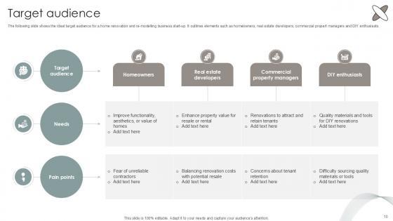 The following slide shows the ideal target audience for a home renovation and re-modelling business start-up. It outlines elements such as homeowners, real estate developers, commercial propert managers and DIY enthusiasts. Explore a selection of the finest Target Audience Interior Design Company Market Entry Plan PPT Template GTM SS V here. With a plethora of professionally designed and pre-made slide templates, you can quickly and easily find the right one for your upcoming presentation. You can use our Target Audience Interior Design Company Market Entry Plan PPT Template GTM SS V to effectively convey your message to a wider audience. Slidegeeks has done a lot of research before preparing these presentation templates. The content can be personalized and the slides are highly editable. Grab templates today from Slidegeeks. The following slide shows the ideal target audience for a home renovation and re-modelling business start-up. It outlines elements such as homeowners, real estate developers, commercial propert managers and DIY enthusiasts.