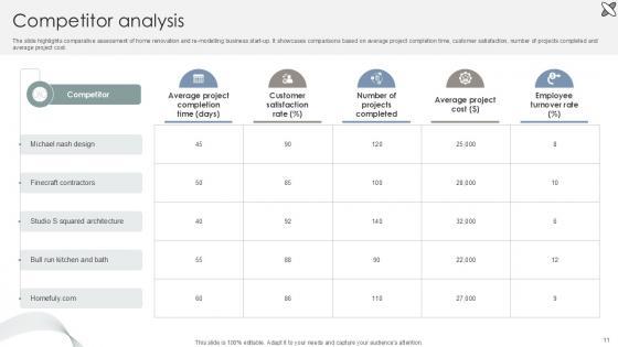 The slide highlights comparative assessment of home renovation and re-modelling business start-up. It showcases comparisons based on average project completion time, customer satisfaction, number of projects completed and average project cost. Want to ace your presentation in front of a live audience Our Competitor Analysis Interior Design Company Market Entry Plan PPT Presentation GTM SS V can help you do that by engaging all the users towards you. Slidegeeks experts have put their efforts and expertise into creating these impeccable powerpoint presentations so that you can communicate your ideas clearly. Moreover, all the templates are customizable, and easy-to-edit and downloadable. Use these for both personal and commercial use. The slide highlights comparative assessment of home renovation and re-modelling business start-up. It showcases comparisons based on average project completion time, customer satisfaction, number of projects completed and average project cost.