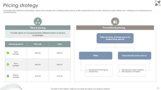 The following slide outlines the pricing strategy used by home renovation and re-modelling business start-up to offer products and services at costs customers are happily willing to pay. It strategies such as tiered pricing and promotional pricing. Make sure to capture your audiences attention in your business displays with our gratis customizable Pricing Strategy Interior Design Company Market Entry Plan PPT PowerPoint GTM SS V. These are great for business strategies, office conferences, capital raising or task suggestions. If you desire to acquire more customers for your tech business and ensure they stay satisfied, create your own sales presentation with these plain slides. The following slide outlines the pricing strategy used by home renovation and re-modelling business start-up to offer products and services at costs customers are happily willing to pay. It strategies such as tiered pricing and promotional pricing.