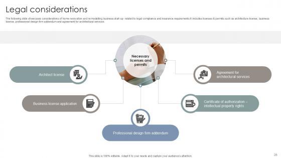 The following slide showcases considerations of home renovation and re-modelling business start-up related to legal compliance and insurance requirements It includes licenses and permits such as architecture license, business license, professional design firm addendum and agreement for architectural services. If your project calls for a presentation, then Slidegeeks is your go-to partner because we have professionally designed, easy-to-edit templates that are perfect for any presentation. After downloading, you can easily edit Legal Considerations Interior Design Company Market Entry Plan PPT Sample GTM SS V and make the changes accordingly. You can rearrange slides or fill them with different images. Check out all the handy templates The following slide showcases considerations of home renovation and re-modelling business start-up related to legal compliance and insurance requirements It includes licenses and permits such as architecture license, business license, professional design firm addendum and agreement for architectural services.