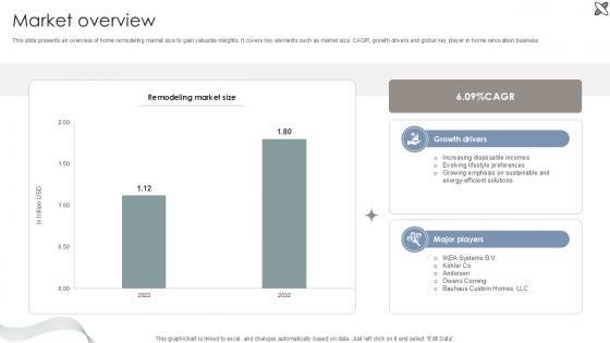 This slide presents an overview of home remodeling market size to gain valuable insights. It covers key elements such as market size, CAGR, growth drivers and global key player in home renovation business. If you are looking for a format to display your unique thoughts, then the professionally designed Market Overview Interior Design Company Market Entry Plan PPT Sample GTM SS V is the one for you. You can use it as a Google Slides template or a PowerPoint template. Incorporate impressive visuals, symbols, images, and other charts. Modify or reorganize the text boxes as you desire. Experiment with shade schemes and font pairings. Alter, share or cooperate with other people on your work. Download Market Overview Interior Design Company Market Entry Plan PPT Sample GTM SS V and find out how to give a successful presentation. Present a perfect display to your team and make your presentation unforgettable. This slide presents an overview of home remodeling market size to gain valuable insights. It covers key elements such as market size, CAGR, growth drivers and global key player in home renovation business