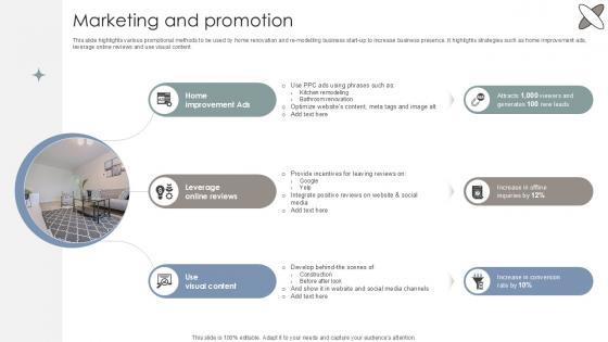 This slide highlights various promotional methods to be used by home renovation and re-modelling business start-up to increase business presence. It highlights strategies such as home improvement ads, leverage online reviews and use visual content. Are you in need of a template that can accommodate all of your creative concepts This one is crafted professionally and can be altered to fit any style. Use it with Google Slides or PowerPoint. Include striking photographs, symbols, depictions, and other visuals. Fill, move around, or remove text boxes as desired. Test out color palettes and font mixtures. Edit and save your work, or work with colleagues. Download Marketing And Promotion Interior Design Company Market Entry Plan PPT Example GTM SS V and observe how to make your presentation outstanding. Give an impeccable presentation to your group and make your presentation unforgettable. This slide highlights various promotional methods to be used by home renovation and re-modelling business start-up to increase business presence. It highlights strategies such as home improvement ads, leverage online reviews and use visual content.
