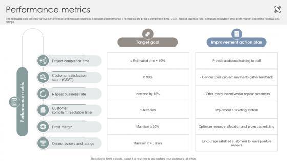 The following slide outlines various KPIs to track and measure business operational performance The metrics are project completion time, CSAT, repeat business rate, complaint resolution time, profit margin and online reviews and ratings. Crafting an eye-catching presentation has never been more straightforward. Let your presentation shine with this tasteful yet straightforward Performance Metrics Interior Design Company Market Entry Plan PPT PowerPoint GTM SS V template. It offers a minimalistic and classy look that is great for making a statement. The colors have been employed intelligently to add a bit of playfulness while still remaining professional. Construct the ideal Performance Metrics Interior Design Company Market Entry Plan PPT PowerPoint GTM SS V that effortlessly grabs the attention of your audience Begin now and be certain to wow your customers The following slide outlines various KPIs to track and measure business operational performance The metrics are project completion time, CSAT, repeat business rate, complaint resolution time, profit margin and online reviews and ratings.