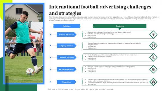 The following slides shows cultural differences, language barriers, consumer behavior, varying regulations and competition to show international football marketing challenges and strategies. It helps organizations to comprehend problems and methods involved in international football marketing, allow broaden reach and achieve success in a variety of areas. Pitch your topic with ease and precision using this International Football Advertising Challenges And Strategies Rules Pdf This layout presents information on Cultural Differences, Language Barriers, Consumer Behaviors It is also available for immediate download and adjustment. So, changes can be made in the color, design, graphics or any other component to create a unique layout. The following slides shows cultural differences, language barriers, consumer behavior, varying regulations and competition to show international football marketing challenges and strategies. It helps organizations to comprehend problems and methods involved in international football marketing, allow broaden reach and achieve success in a variety of areas.