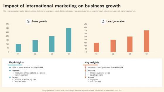 This slide represents impact of global marketing strategies on organization growth. It includes increase in sales revenue and lead generation rate leading to revenue growth, market expansion etc.Do you have to make sure that everyone on your team knows about any specific topic I yes, then you should give Impact Of International Marketing International Marketing Strategy Demonstration Pdf a try. Our experts have put a lot of knowledge and effort into creating this impeccable Impact Of International Marketing International Marketing Strategy Demonstration Pdf. You can use this template for your upcoming presentations, as the slides are perfect to represent even the tiniest detail. You can download these templates from the Slidegeeks website and these are easy to edit. So grab these today. This slide represents impact of global marketing strategies on organization growth. It includes increase in sales revenue and lead generation rate leading to revenue growth, market expansion etc.