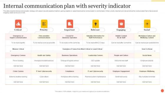 This slide presents internal communication strategy with cases in severity spectrum helpful in gaining insights on cases that should be communicated on priority basis. Critical, priority, important and relevant should be communicated fast while social and engaging cases can be put on hold. Pitch your topic with ease and precision using this Internal Communication Plan With Severity Indicator Ppt Infographics Infographic Template Pdf. This layout presents information on Critical, Priority, Important, Relevant. It is also available for immediate download and adjustment. So, changes can be made in the color, design, graphics or any other component to create a unique layout. This slide presents internal communication strategy with cases in severity spectrum helpful in gaining insights on cases that should be communicated on priority basis. Critical, priority, important and relevant should be communicated fast while social and engaging cases can be put on hold.