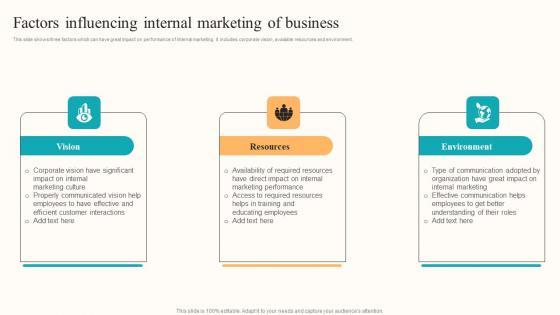 This slide shows three factors which can have great impact on performance of internal marketing. It includes corporate vision, available resources and environment. This Implementing Internal Marketing Factors Influencing Internal Marketing Of Business Graphics PDF from Slidegeeks makes it easy to present information on your topic with precision. It provides customization options, so you can make changes to the colors, design, graphics, or any other component to create a unique layout. It is also available for immediate download, so you can begin using it right away. Slidegeeks has done good research to ensure that you have everything you need to make your presentation stand out. Make a name out there for a brilliant performance.