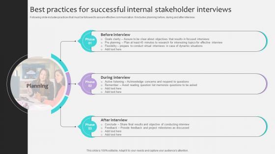 Following slide includes practices that must be followed to assure effective communication. It includes planning before, during and after interview. Do you have to make sure that everyone on your team knows about any specific topic I yes, then you should give Project Stakeholders Management Best Practices For Successful Internal Ppt Powerpoint a try. Our experts have put a lot of knowledge and effort into creating this impeccable Project Stakeholders Management Best Practices For Successful Internal Ppt Powerpoint. You can use this template for your upcoming presentations, as the slides are perfect to represent even the tiniest detail. You can download these templates from the Slidegeeks website and these are easy to edit. So grab these today Following slide includes practices that must be followed to assure effective communication. It includes planning before, during and after interview.
