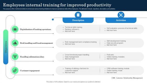 The purpose of the mentioned slide is to showcase various training initiatives to improve operational skills of the employees. The attributes include objectives, description, and acitvities. This modern and well-arranged Employees Internal Training For Improved Productivity Incorporating Banking Operational Growth provides lots of creative possibilities. It is very simple to customize and edit with the Powerpoint Software. Just drag and drop your pictures into the shapes. All facets of this template can be edited with Powerpoint, no extra software is necessary. Add your own material, put your images in the places assigned for them, adjust the colors, and then you can show your slides to the world, with an animated slide included. The purpose of the mentioned slide is to showcase various training initiatives to improve operational skills of the employees. The attributes include objectives, description, and acitvities
