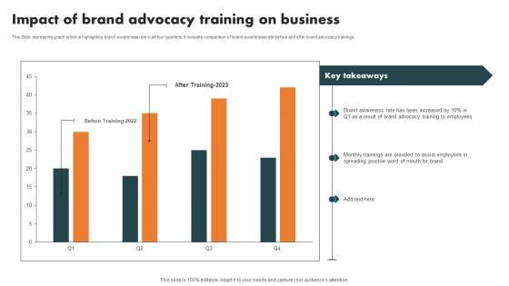 This slide represents graph which is highlighting brand awareness rate in all four quarters. It includes comparison of brand awareness rate before and after brand advocacy trainings. Do you know about Slidesgeeks Implementing Internal Marketing Impact Of Brand Advocacy Training On Business Themes PDF These are perfect for delivering any kind od presentation. Using it, create PowerPoint presentations that communicate your ideas and engage audiences. Save time and effort by using our pre-designed presentation templates that are perfect for a wide range of topic. Our vast selection of designs covers a range of styles, from creative to business, and are all highly customizable and easy to edit. Download as a PowerPoint template or use them as Google Slides themes.