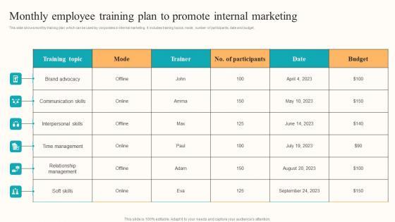 This slide shows monthly training plan which can be used by corporates in internal marketing. It includes training topics, mode, number of participants, date and budget. Do you have an important presentation coming up Are you looking for something that will make your presentation stand out from the rest Look no further than Implementing Internal Marketing Monthly Employee Training Plan To Promote Information PDF. With our professional designs, you can trust that your presentation will pop and make delivering it a smooth process. And with Slidegeeks, you can trust that your presentation will be unique and memorable. So why wait Grab Implementing Internal Marketing Monthly Employee Training Plan To Promote Information PDF today and make your presentation stand out from the rest.