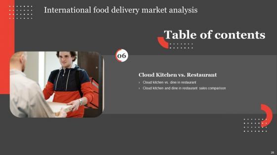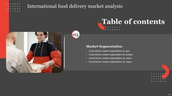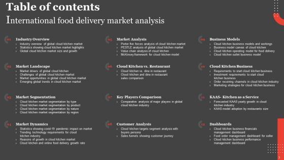 Slidegeeks is here to make your presentations a breeze with Table Of Contents International Food Delivery Market Analysis Brochure Pdf With our easy-to-use and customizable templates, you can focus on delivering your ideas rather than worrying about formatting. With a variety of designs to choose from, you are sure to find one that suits your needs. And with animations and unique photos, illustrations, and fonts, you can make your presentation pop. So whether you are giving a sales pitch or presenting to the board, make sure to check out Slidegeeks first. Our Table Of Contents International Food Delivery Market Analysis Brochure Pdf are topically designed to provide an attractive backdrop to any subject. Use them to look like a presentation pro.
