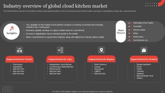 This slide presents an overview of cloud kitchen market to gain valuable insights. It covers key elements such as industry insights, major players, segmentation by nature, type, region and products. Welcome to our selection of the International Food Delivery Market Industry Overview Of Global Cloud Kitchen Market Topics Pdf. These are designed to help you showcase your creativity and bring your sphere to life. Planning and Innovation are essential for any business that is just starting out. This collection contains the designs that you need for your everyday presentations. All of our PowerPoints are 100 percent editable, so you can customize them to suit your needs. This multi-purpose template can be used in various situations. Grab these presentation templates today. This slide presents an overview of cloud kitchen market to gain valuable insights. It covers key elements such as industry insights, major players, segmentation by nature, type, region and products.