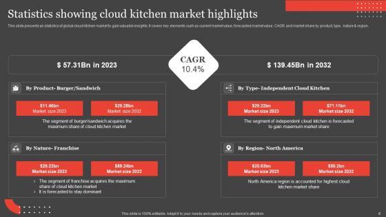 This slide presents an statistics of global cloud kitchen market to gain valuable insights. It covers key elements such as current market value, forecasted market value, CAGR and market share by product, type, nature and region. Do you know about Slidesgeeks International Food Delivery Market Statistics Showing Cloud Kitchen Market Guidelines Pdf These are perfect for delivering any kind od presentation. Using it, create PowerPoint presentations that communicate your ideas and engage audiences. Save time and effort by using our pre-designed presentation templates that are perfect for a wide range of topic. Our vast selection of designs covers a range of styles, from creative to business, and are all highly customizable and easy to edit. Download as a PowerPoint template or use them as Google Slides themes. This slide presents an statistics of global cloud kitchen market to gain valuable insights. It covers key elements such as current market value, forecasted market value, CAGR and market share by product, type, nature and region.