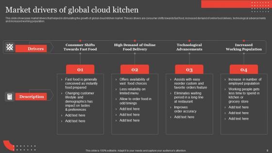 This slide showcases market drivers that helped in stimulating the growth of global cloud kitchen market. Theses drivers are consumer shifts towards fast food, increased demand of online food delivery, technological advancements and increased working population. There are so many reasons you need a Market Drivers Of Global Cloud Kitchen International Food Delivery Market Professional Pdf. The first reason is you can not spend time making everything from scratch, Thus, Slidegeeks has made presentation templates for you too. You can easily download these templates from our website easily. This slide showcases market drivers that helped in stimulating the growth of global cloud kitchen market. Theses drivers are consumer shifts towards fast food, increased demand of online food delivery, technological advancements and increased working population.