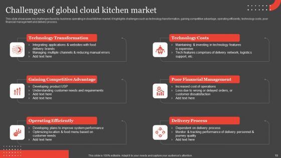 This slide showcases key challenges faced by business operating in cloud kitchen market. It highlights challenges such as technology transformation, gaining competitive advantage, operating efficiently, technology costs, poor financial management and delivery process. Get a simple yet stunning designed International Food Delivery Market Challenges Of Global Cloud Kitchen Market Guidelines Pdf. It is the best one to establish the tone in your meetings. It is an excellent way to make your presentations highly effective. So, download this PPT today from Slidegeeks and see the positive impacts. Our easy-to-edit International Food Delivery Market Challenges Of Global Cloud Kitchen Market Guidelines Pdf can be your go-to option for all upcoming conferences and meetings. So, what are you waiting for Grab this template today. This slide showcases key challenges faced by business operating in cloud kitchen market. It highlights challenges such as technology transformation, gaining competitive advantage, operating efficiently, technology costs, poor financial management and delivery process.
