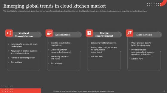 The slide highlights emerging trends in global cloud kitchen market for sustainable growth and development. It highlights trends such as vertical consolidation, automation, recipe improvement and data driven. Formulating a presentation can take up a lot of effort and time, so the content and message should always be the primary focus. The visuals of the PowerPoint can enhance the presenters message, so our International Food Delivery Market Emerging Global Trends In Cloud Kitchen Market Clipart Pdf was created to help save time. Instead of worrying about the design, the presenter can concentrate on the message while our designers work on creating the ideal templates for whatever situation is needed. Slidegeeks has experts for everything from amazing designs to valuable content, we have put everything into International Food Delivery Market Emerging Global Trends In Cloud Kitchen Market Clipart Pdf. The slide highlights emerging trends in global cloud kitchen market for sustainable growth and development. It highlights trends such as vertical consolidation, automation, recipe improvement and data driven.